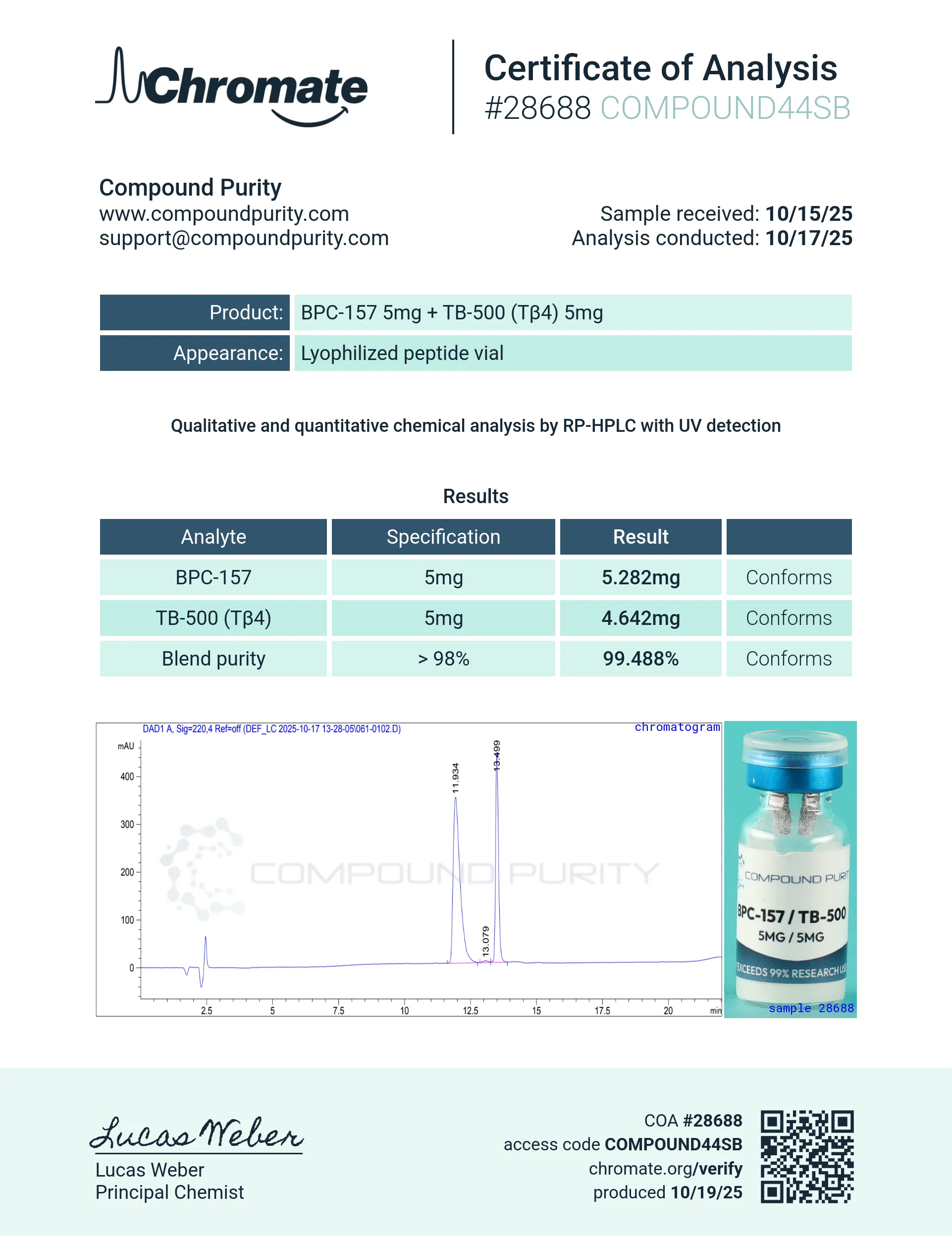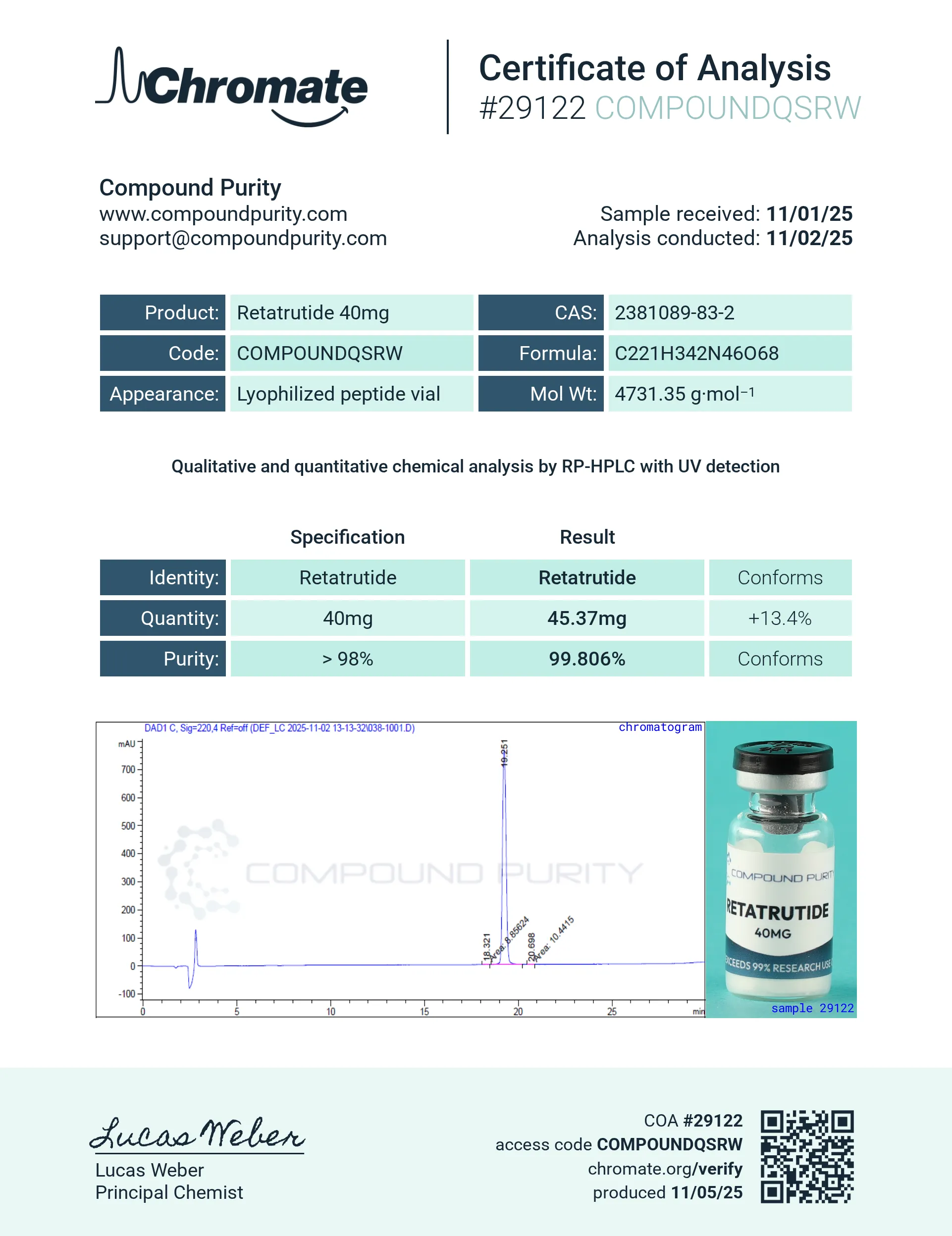 Compound Purity offers high-quality research peptides and products that are pure, potent, stable, and safe. We test via a 3rd party lab and provide the results for each product we sell.
