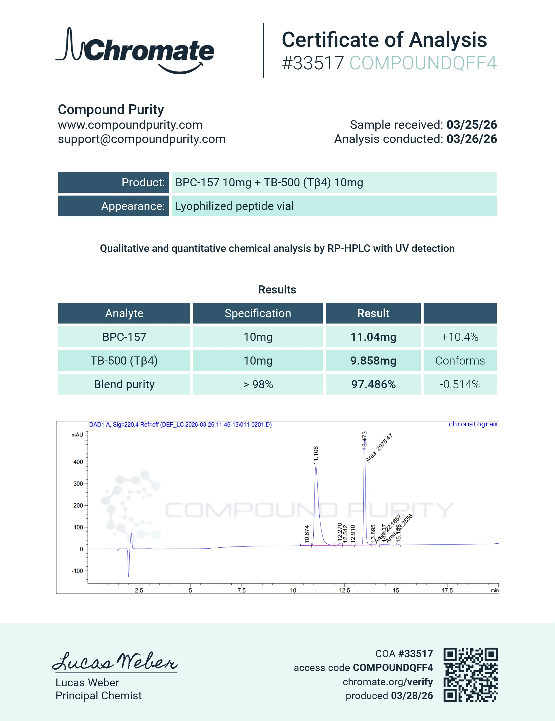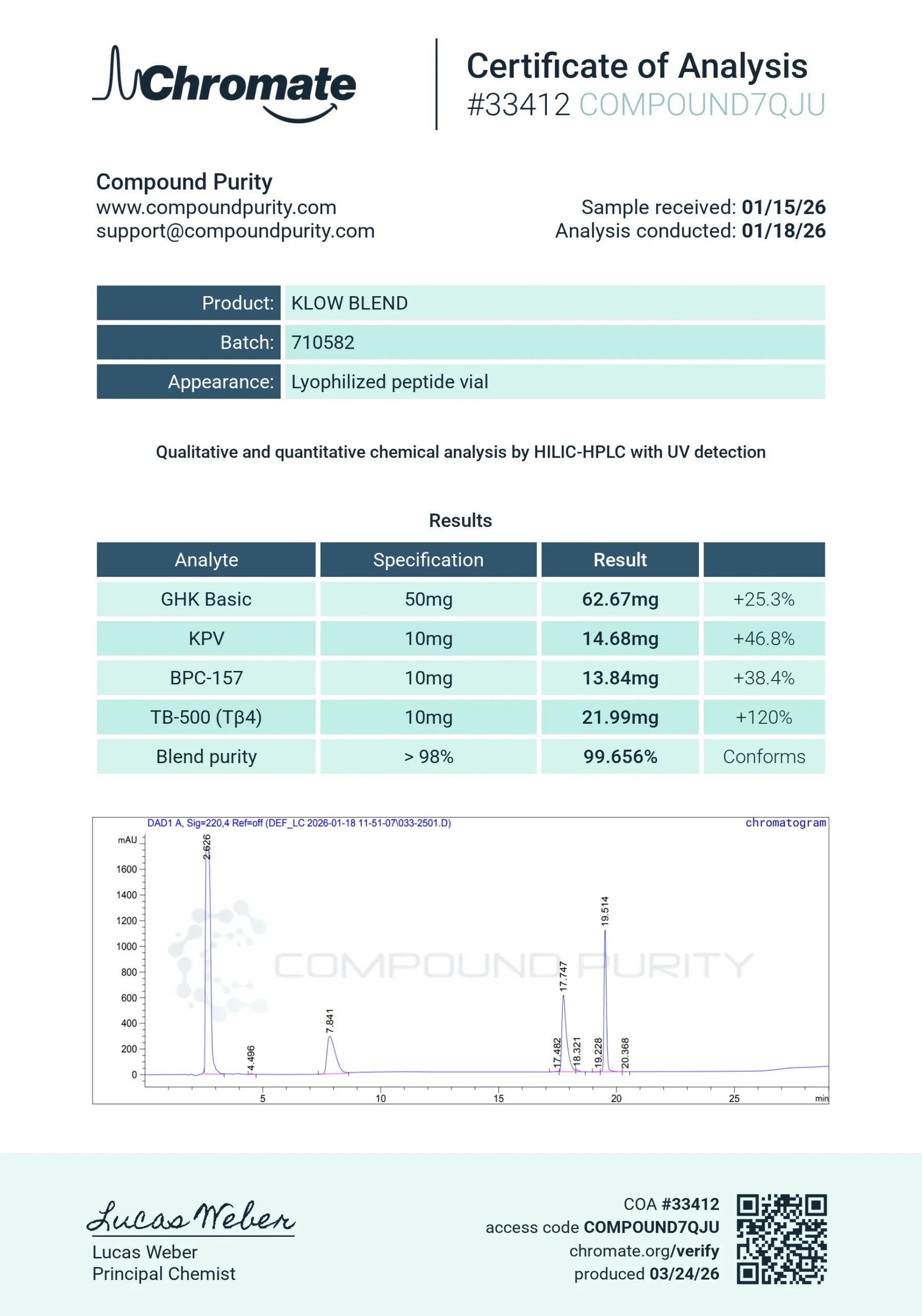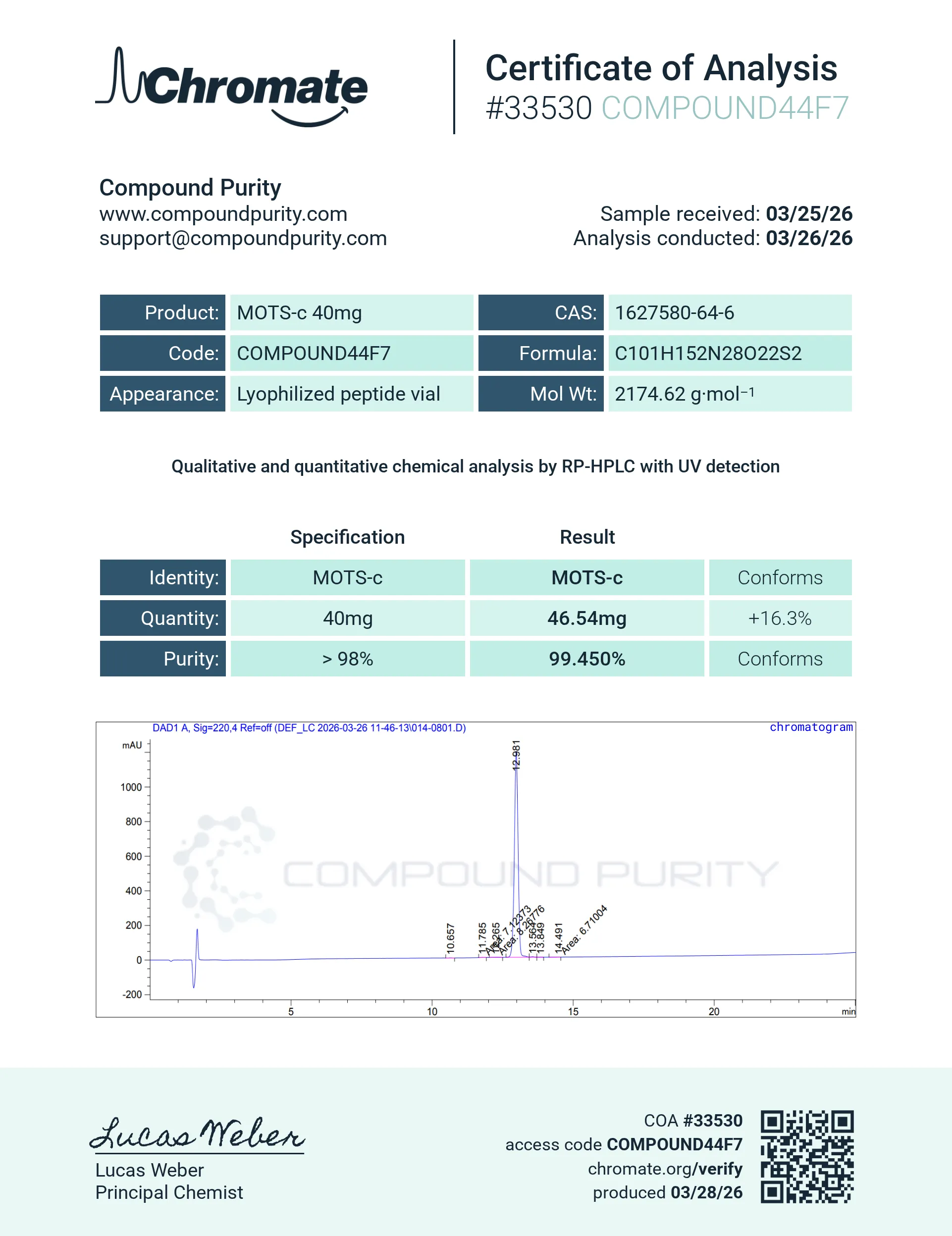 “Compound Purity” products are intended solely for laboratory research purposes and are not to be used for any other purposes, including but not limited to vitro diagnostic purpose, in food drugs, medical devices, or cosmetics for humans or animals or for commercial purposes. The purchaser agrees that the products have not been sterilized or tested by “Compound Purity” for safety and efficacy in food, drug, medical device, cosmetic, commercial or any other use.
