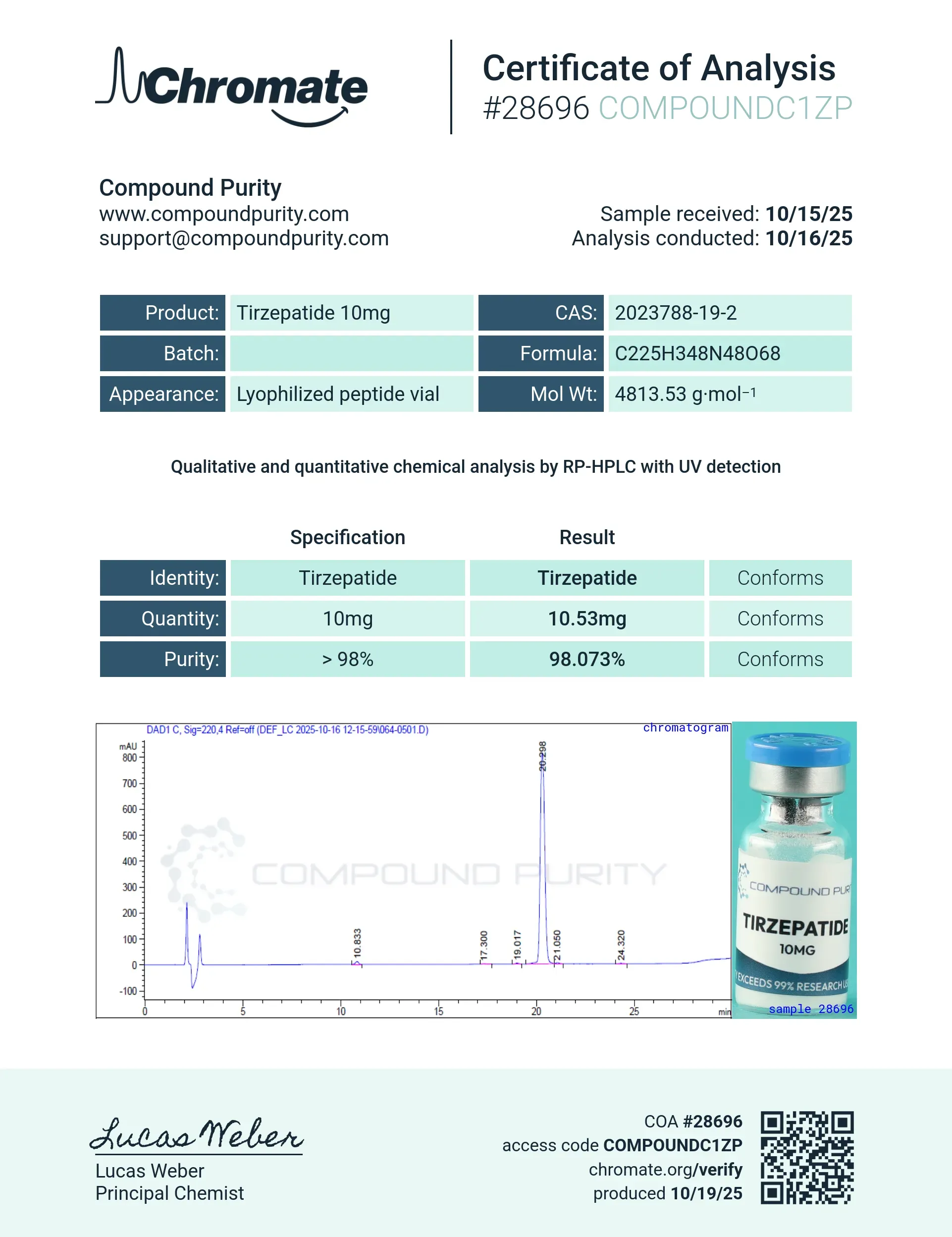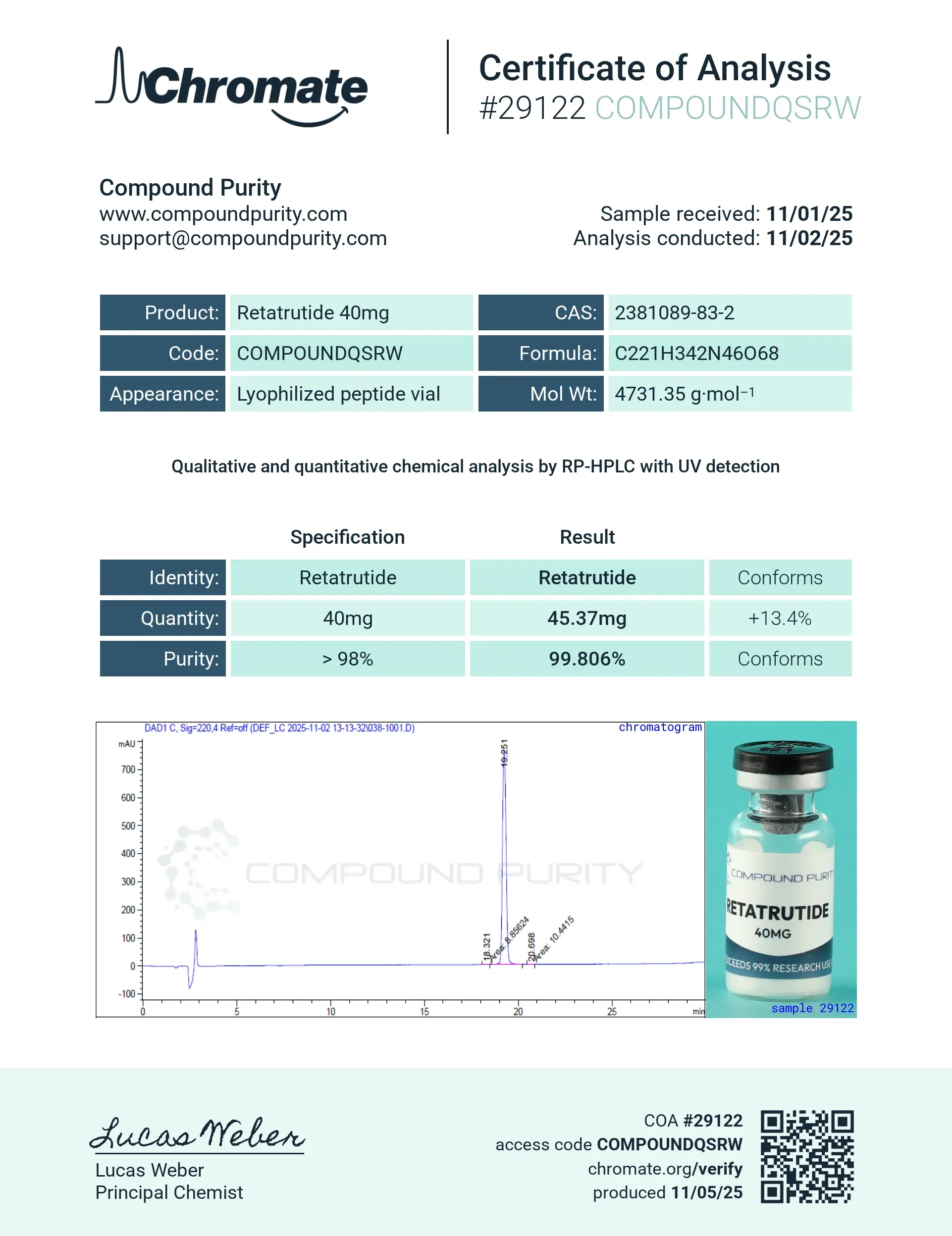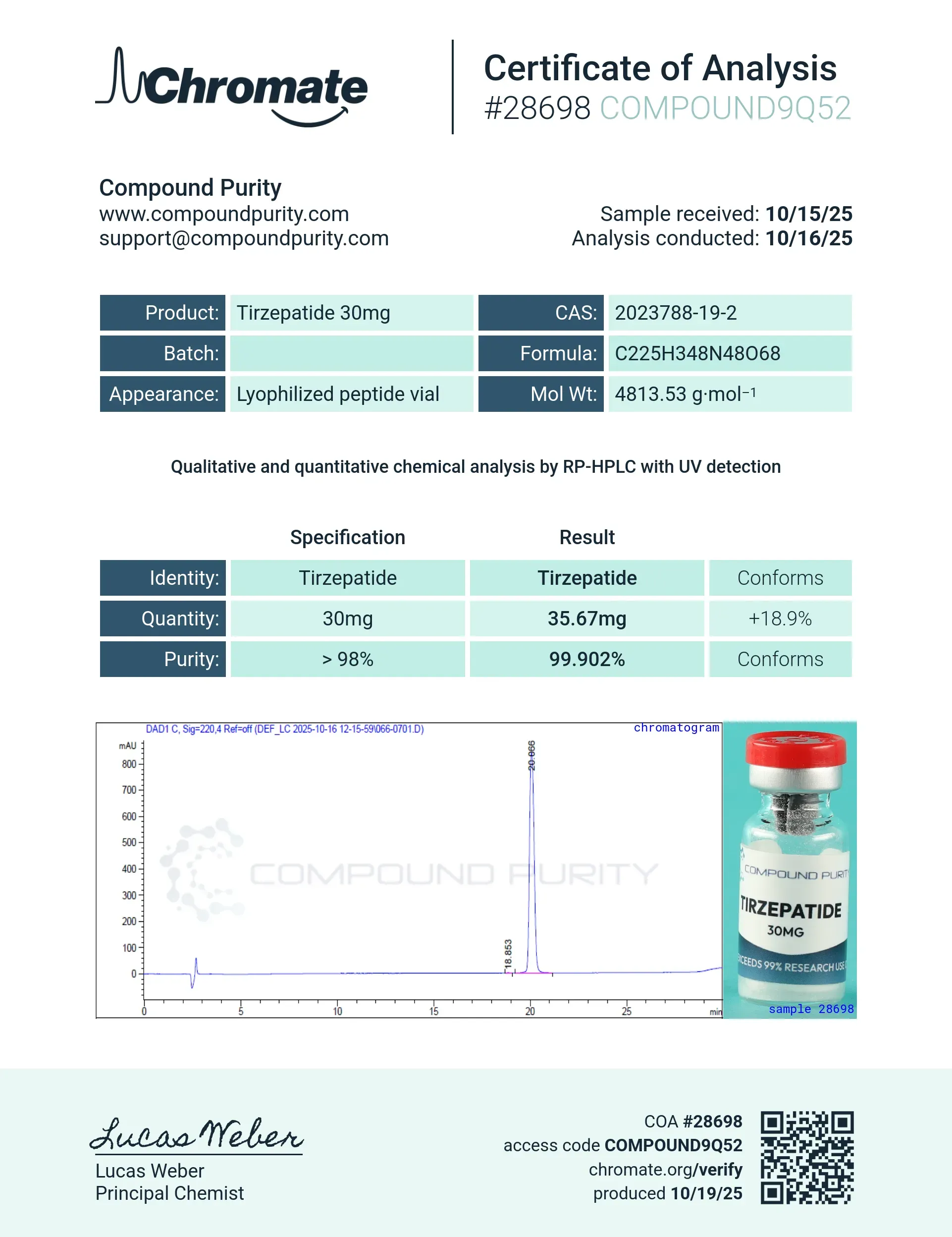 “Compound Purity” products are intended solely for laboratory research purposes and are not to be used for any other purposes, including but not limited to vitro diagnostic purpose, in food drugs, medical devices, or cosmetics for humans or animals or for commercial purposes. The purchaser agrees that the products have not been sterilized or tested by “Compound Purity” for safety and efficacy in food, drug, medical device, cosmetic, commercial or any other use.