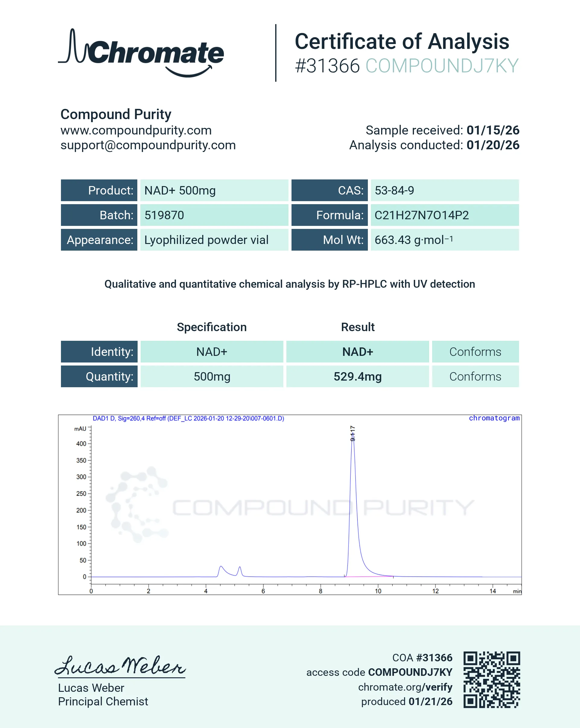 $120.00Original price was: $120.00.$60.00Current price is: $60.00.500mg vial of NAD+ lyophilized powder.